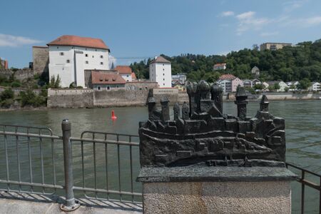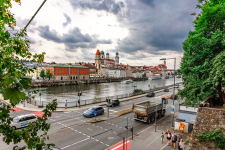 Passau, Germany - July 21, 2023: Panoramic view of Passau. Aerial skyline of old town with beautiful reflection in Danube river, Bavaria, Germany.