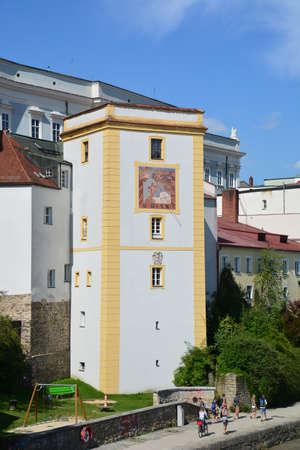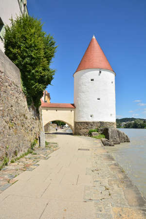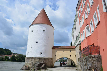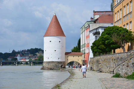 Panoramic view Schaibling Tower and promenade on river Inn, Passau, Lower Bavaria, Germany.