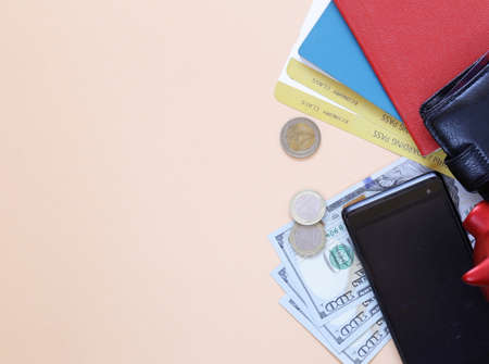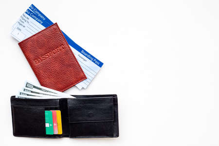 International passport with airline boarding pass and money for travel, yellow office desk and table top view