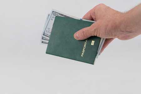 Hand holds out green passport with usa dollars. Concept - briber and corruption