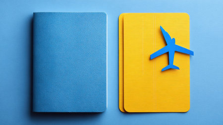 Items for travel preparation include a blue passport next to a yellow itinerary with a paper airplane cutout, set against a solid blue background.