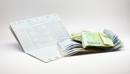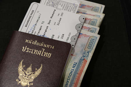 Thai passport with boarding pass and Kyat money of Myanmar on black floor, the concept of travel.