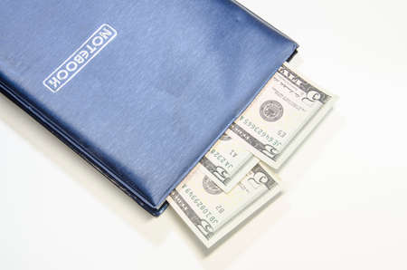 on the table a check from the supermarket and dollars were brought in notebooks, a paper receipt with purchases, money and checks from the supermarket were brought in a notebook