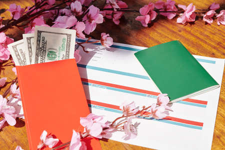 Plane tickets, passport and traditional red lucky money envelopes gifted for Chinese New Year