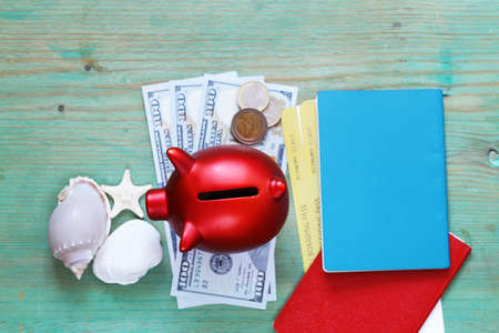 Save up for traveling. Piggy bank with passport on pink background. Top view. Flat lay