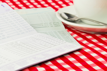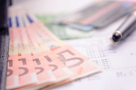 calculating bills for month, budget is limited. only some cash is in a wallet on a table. coffee helps to concentrate