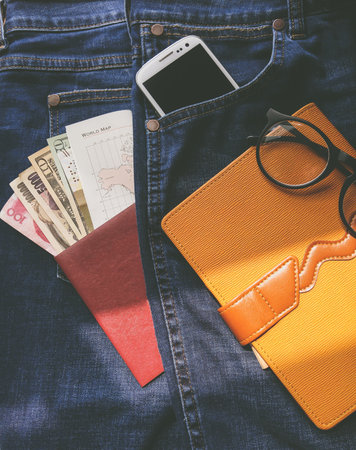 Thailand passport with money, pencil and yellow ruler for blank notebook (write your travel note), mobile phone and glasses - concept prepare to travel.