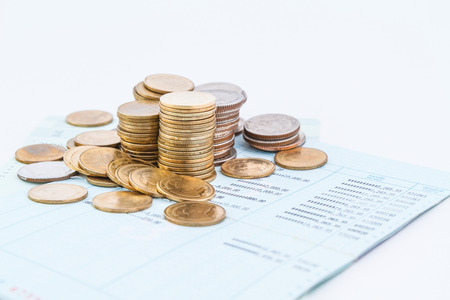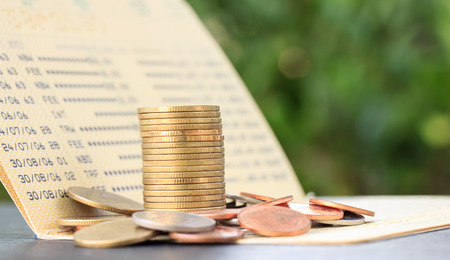 Top view of man hand coins statement book bank account of double exposure of Bar graph for finance banking concept