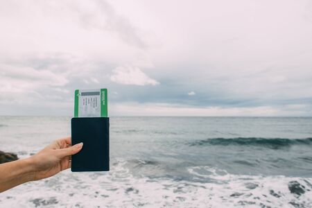 Buy tickets for travel. Tickets on wooden table background top view copyspace