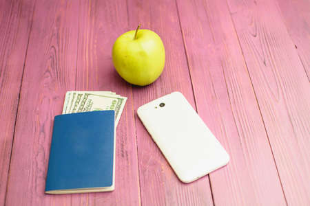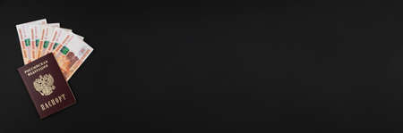 Passport, money and laptop on wooden table. Russian passport. Preparing for travel