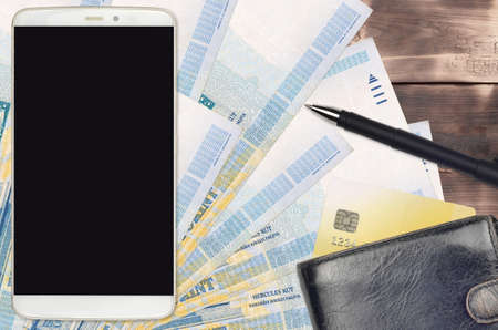 1000 Hungarian forint bills and smartphone with purse and credit card. E-payments or e-commerce concept. Online shopping and business with portable devices usage