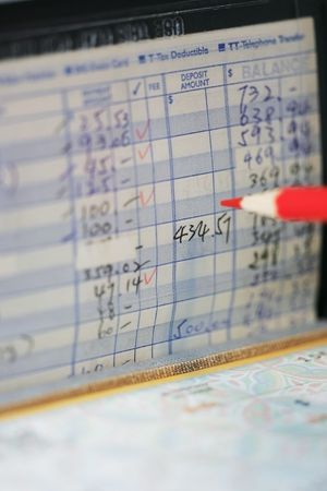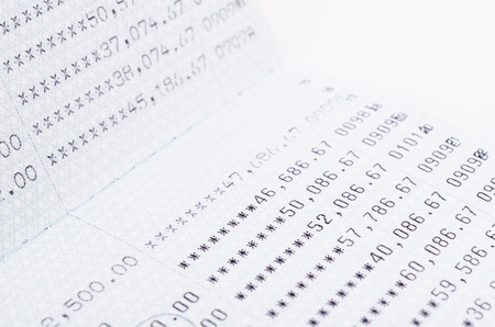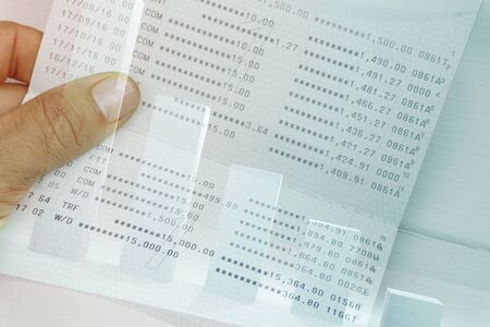 Finger holding pencil Point Data Numeric withdrawal amount on Accounting Bank book. Plan Investment Income for 2023 New Year. Business or Finance concept. Information Pay.