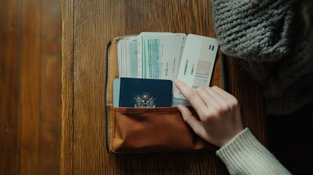 A traveler's hand reaching for a passport and airplane tickets from a neatly organized travel pouch