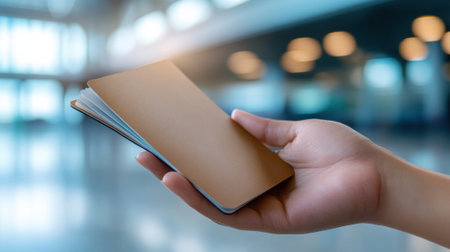 Mockup of green book on woman hand with copy space for your text or . A persons holding a notebook mock-up. Layout mock up ready for promotional advertisement