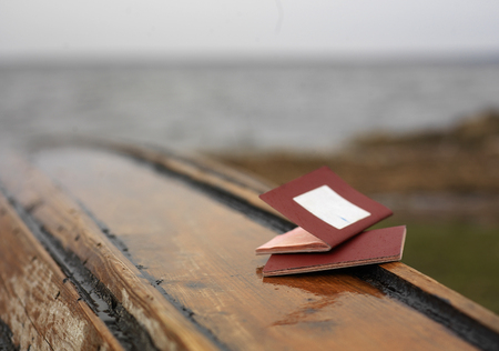 Two passports laid on the tipped over wooden boat, shallow depth of field
