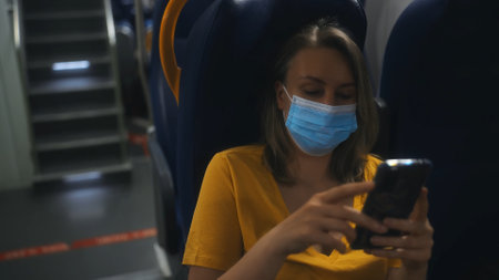 Woman in medical mask travelling inside the train.