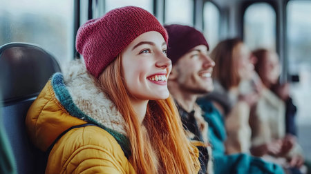 A group of young adults enjoys a train ride, capturing moments of joy and connection. Laughter and smiles create a warm and vibrant atmosphere, perfect for sharing experiences together.