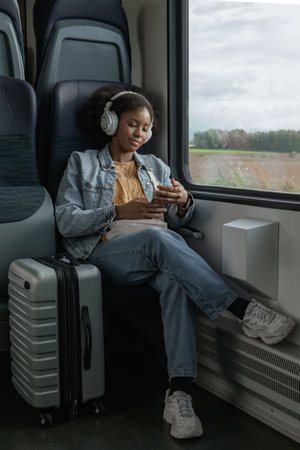 Smiling young African American woman enjoying her European rail journey and comfortable traveling, looking out the train window.