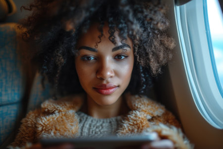 Business people working with digital tablet on aeroplane. Generative AI