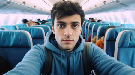 Happy tourist man taking selfie inside airplane, Cheerful guy on summer vacation, Passenger boarding on plane, Holidays and transportation.