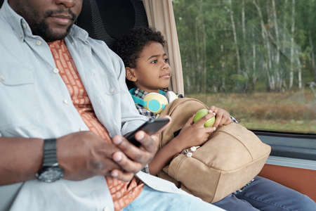 Cute Black boy with curly hair embracing satchel while sitting with father in bus