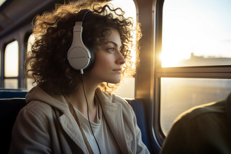 a woman passenger wearing headphones on the train bokeh style background