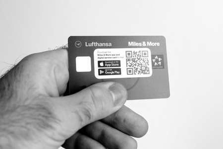 Frankfurt, Germany - Dec 18, 2018: Man holding against white background a new Lufthansa Miles and More traveler loyalty programme card - black and white