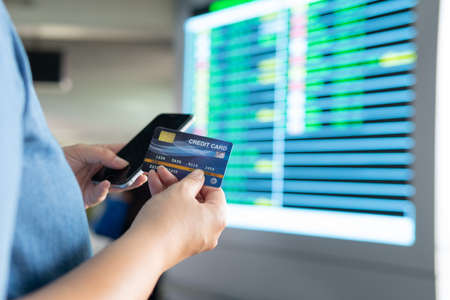 Asian woman hand paying conctactless with plastic card for the public transport in bus, tram or subway metro close up