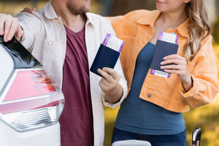 Cropped view of woman with passport and air ticket hugging husband near car outdoors