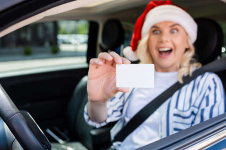 Young asian man sitting in the modern car and holding blank of white card. For car rental or car business concept