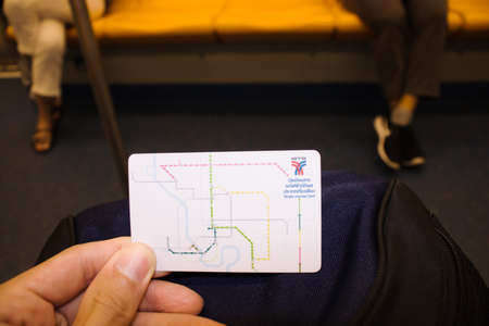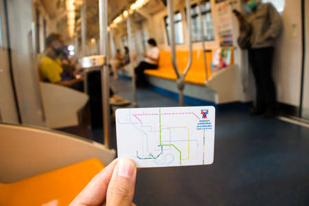 BTS. The Bangkok Mass Transit System - hand show ticket on train : 12 October 2020 - Bangkok, Thailand.
