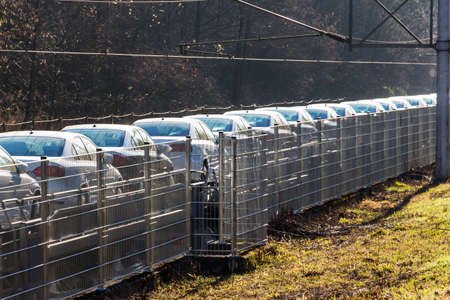 Rows of a new cars parked in a distribution center on a sunny day in the spring, a car factory. Parking in the open air.