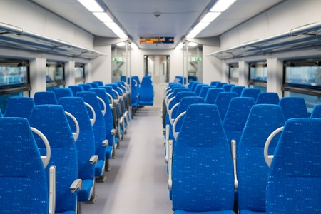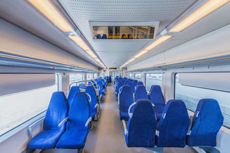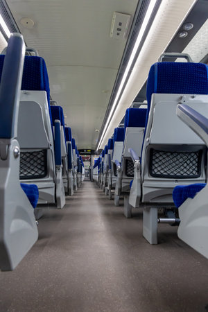 Inside The Wagon Train Germany, Dusseldorf. Empty train interior. interior view of corridor inside passenger trains with blue fabric seats of German railway train system.