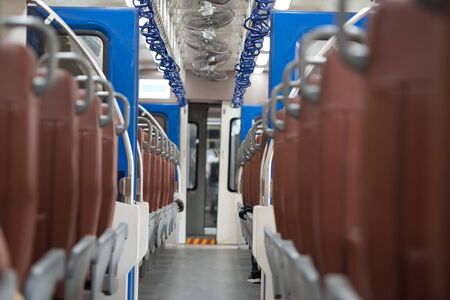 Interior of an empty metro carriage in Brussels, Belgium, selective focus.