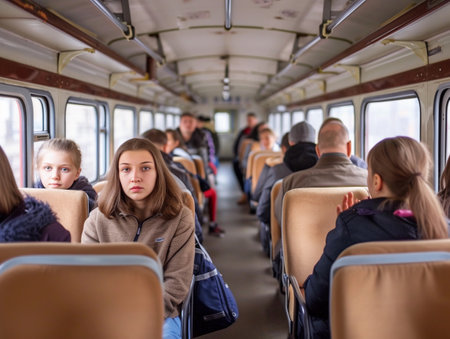 Blonde casual caucasian lady traveling by train Train full of passengers going to work by public transport at rush hour