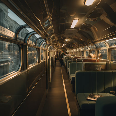 Warm sunlight illuminates a vintage train carriage interior, passengers relaxing in comfortable seats as the train travels through a picturesque landscape