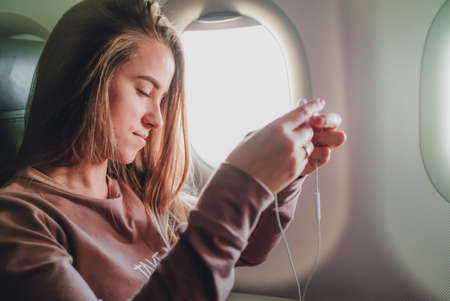 Passenger sitting on the seat in aircraft cabin looking through the window.
