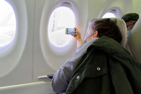 Woman taking picture through airplane window. Taking photo on airplane. close up