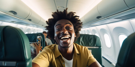 Happy tourist man taking selfie inside airplane, Cheerful guy on summer vacation, Passenger boarding on plane, Holidays and transportation.