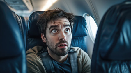 Young man in airplane aisle looks shocked, eyes wide open, expressing fear of flying or dramatic turbulence during flight.