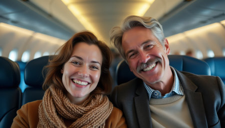 A cheerful woman and a distinguished older man sit side by side on an airplane, radiating happiness. Their warm smiles and cozy attire create a sense of connection and adventure, perfect for travel enthusiasts.