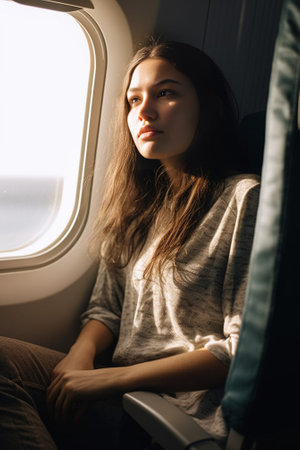 Inside an airplane cabin, rows of passengers sit in seats. The composition features soft lighting, highlighting the textures of the seats and the people. This image presents a perspective suggesting a journey. It could be used in various applications for travel or transportation themes.