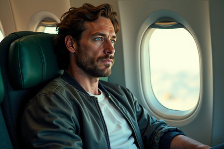 A man wearing a cap and sunglasses gazes out of a plane window, capturing a moment of quiet reflection during his travels.