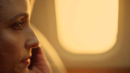 Confident businesswoman talking mobile phone closeup. Portrait company ceo on private jet. Focused woman using smartphone calling partner at airplane window. Luxury entrepreneur on business travel