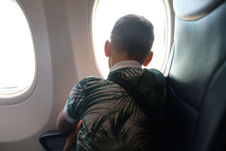 Passenger traveler looking at window in airplane, travel by flight, man tourist sitting in air plane. Travel concept
