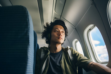 Young Asian man inside a plane. Life as a traveler and entrepreneur in Asia.