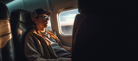 Man in airplane seat with a cap and glasses, looking out the porthole, ready for travels. Banner for design with copy space