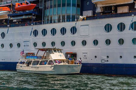 NEW YORK, USA - OCTOBER 08: View of a ferry boat crossing the East River to Brooklyn, these boats are a type of public transportation on October 08, 2019 in New York