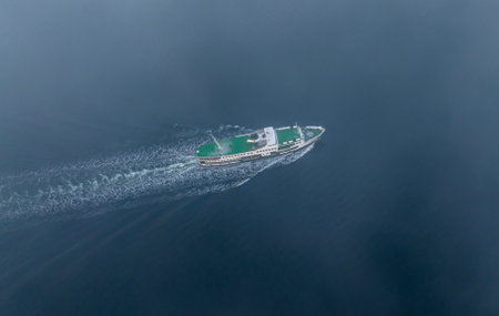 A large ferry moves through thick fog on calm waters during a misty early morning. Passengers enjoy the serene atmosphere while surrounded by haze and silence.