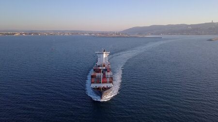 A large ocean-going cargo ship moves out to sea on calm waters. Dry cargo ship aerial view